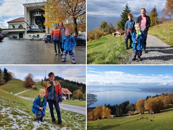 Die gestrige Schlechtwetter-Front ist in der Nacht glücklicherweise abgezogen, Temperaturen um 10°C mit gelegentlichem Sonnenschein bieten perfekte Wanderbedingungen. Zunächst geht es nach dem Frühstücks-Ritual mit dem Auto gen Osten bis zur Talstation der Pfänderbahn in Bregenz. Halb 12 beginnen wir den Aufstieg und folgen dabei dem gleichen Weg, den wir bereits vor zwei Jahren runtergelaufen sind. Gelegentlich öffnet sich der Wald und gibt einen wunderbaren Panorama-Blick frei auf den Bodensee, in der Sonne wird es sogar richtig warm. Arthur kämpft sich gemeinsam mit Felix tapfer über die steinigen Wege und rutschigen Wurzeln aufwärts, aufkommende Motivations-Löcher lassen sich erfolgreich mit Apfelstücken, Reiswaffeln und Gummitierchen bekämpfen. Nach knapp 2.5h und 3.6km/580Hm ist die Bergstation auf dem Pfänder erreicht. Wir genießen die Aussicht auf die leicht angezuckerten Berge im Bregenzerwald und fahren gegen 15 Uhr wieder mit der Bahn zu Tale. Auf dem Rückweg ergibt sich in Friedrichshafen noch ein spontaner Nachmittags-Snack mit Döner und Eis, um die Energie-Reserven aufzufüllen.