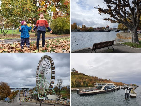 Bei einer frischen Brise aus Süden und stark bewölktem Himmel setzen wir am Vormittag mit der Fähre nach Konstanz über. Vom Fährhafen in Staad spazieren wir durch die beschaulichen Siedlungsgebiete und den Lorettowald zur Konstanzer Bucht. Hier an der Promenade bietet sich ein weitläufiges Panorama auf die Altstadt und den Rhein-Abfluss, ein Earthcache informiert zur Geologie und Nutzung des Bodensees. Hinter dem mächtigen Münster gibt’s gegen halb 2 erstmal einen Mittagssnack, bevor wir weiter durch das Zentrum in Richtung SeaLife schlendern. Dort lädt das Jupiter-Riesenrad zu einer Fahrt in luftiger Höhe mit fantastischem Ausblick ein. Über den Konstanzer Hafen vorbei an der Imperia machen wir uns auf den Rückweg und sind gegen 16 Uhr wieder in Meersburg. Am Abend übernimmt mal Felix die Arthur-Aufsicht, während wir in der Winzerstube um die Ecke auf unseren 15. Hochzeitstag anstoßen.