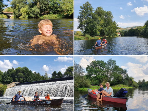 Die erholsame und ruhige Nacht im Tipi ist gehen 8 Uhr zu Ende als Arthur wach wird, eine Stunde später gibt’s im Schatten des großen Kastanienbaums Frühstück mit Brötchen, Marmelade, Nutella, Obst und Tee. Dann noch Katzenwäsche, die Schlafsäcke zusammenpacken, bezahlen (40 EUR/Tipi) und die Boote mitsamt Gepäck zur Einstiegstelle rollern. Bevor es halb 12 wieder losgeht, haben wir in der Saale-Strömung noch einen erfrischenden Badespaß. Nach 6km erwartet uns das nächste Highlight mit der Bootsrutsche am Kahlaer Wehr, in zwei Wellen geht es mit etwas Nervenkitzel und viel Freude gut 2m runter. Die anschließende Strecke ist dafür etwas ruhiger bis wir kurz vorm Schöpser Wehr ein Schwingseil am Baum entdecken, da halten wir natürlich für eine Badepause mit akrobatischen Einlagen. Vor der anschließenden längeren Umtragestelle reduzieren wir das Gewicht der Kanus im Rahmen einer Mittagsrast. Das letzte Stück bietet an den Stromschnellen hinter Rothenstein nochmal etwas Action, zudem warten einige Schätze der Serie Nasse Angelegenheiten darauf entdeckt zu werden. Schon bald darauf ragt über uns die Autobahnbrücke auf und gegen 17 Uhr ist das heutige Teilstück mit Ankunft am Burgauer Wehr geschafft. Was für ein tolles Wochenende!
