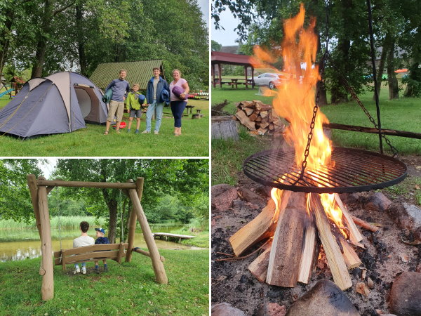 Nach einem herzhaften Frühstück rollen wir auf der mittlerweile auch hier vierstreifig ausgebauten S8 knapp zwei Stunden bis Augustow und besorgen dort zunächst im Kaufland die Lebensmittel für die nächsten Tage. Jetzt nochmal einige Kilometer auf der DK16 in Richtung Litauen, in Giby abbiegen um den immer schmaler werdenden Straßen ins Ländliche zu folgen und schließlich sind wir nach insgesamt 1.100km gegen 14 Uhr beim Bootverleih in Mackowa Ruda. Aufgrund der wechselhaften Wettervorhersage beschließen wir hier auf dem zugehörigen Biwakplatz unser Zelt dauerhaft aufzuschlagen (120 PLN/Nacht), immerhin kommen wir so in den Genuss von Dusche und WC statt Plumpsklo. Zudem haben wir direkt am Zelt unsere private Feuerstelle mit Dreibein-Schwenkrost die wir nun jeden Abend für Knobi-Brot, Glutkartoffeln und Würstchen nutzen.