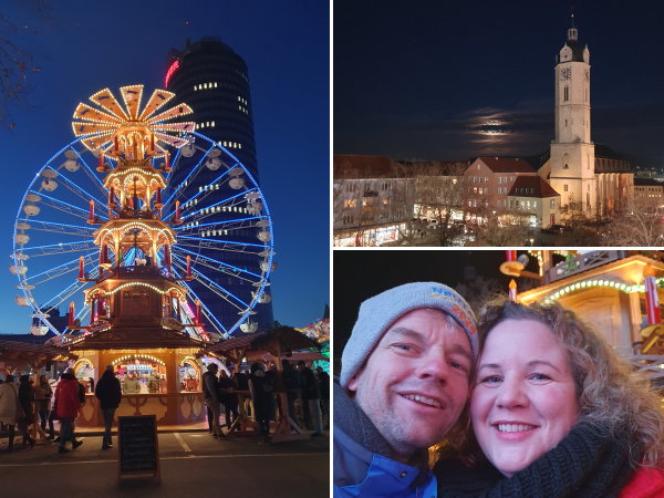Für den stimmungsvollen Einstieg ins zweite Advents-Wochenende lassen wir uns zur magischen blauen Stunde wie Motten von den funkelnden Lichtern im Jenaer Zentrum anlocken. Los geht’s mit einer Panorama-Runde auf dem Riesenrad gefolgt von einem wärmenden Glühwein, während Arthur den Weg durchs Glashaus-Labyrinth sucht. Anschließend finden sich auf dem Markt noch kleine Leckereien mit Crepe und gebrannten Mandeln musikalisch umrahmt von den Rathaus-Turmbläsern.